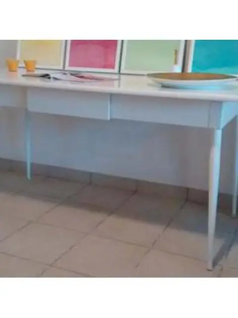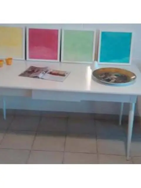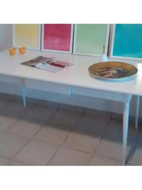 Tavolo vintage anni 60 restaurato color bianco seta con cassetto gambe in acciaio misura cm 160 per 70 alto cm 80, incluso nel prezzo regalo 4 quadri fatti a mano " Le 4 stagioni" acrilico su carta no perditempo grazie 3343393589