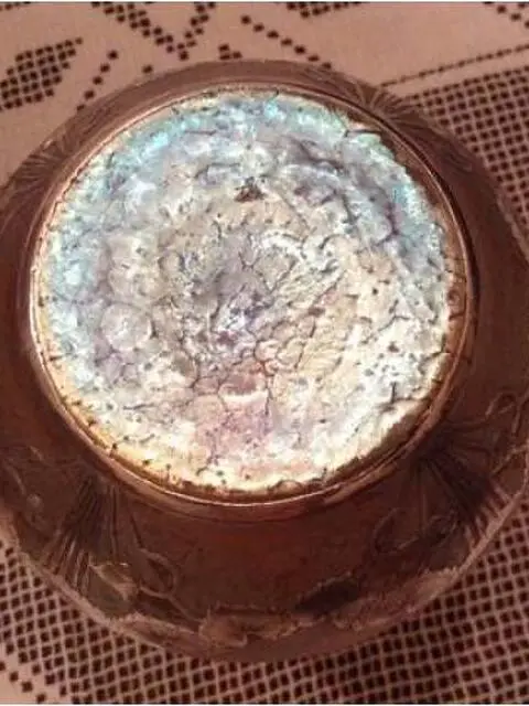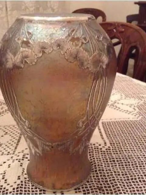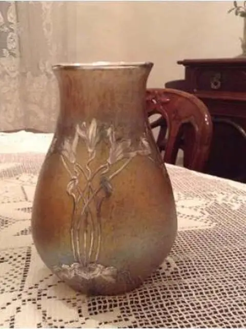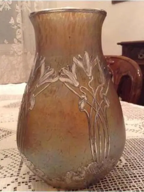 Vaso in vetro soffiato madreperlato con innesti di argento a motivi floreali incisi e traforati epoca fine XIX inizio XX