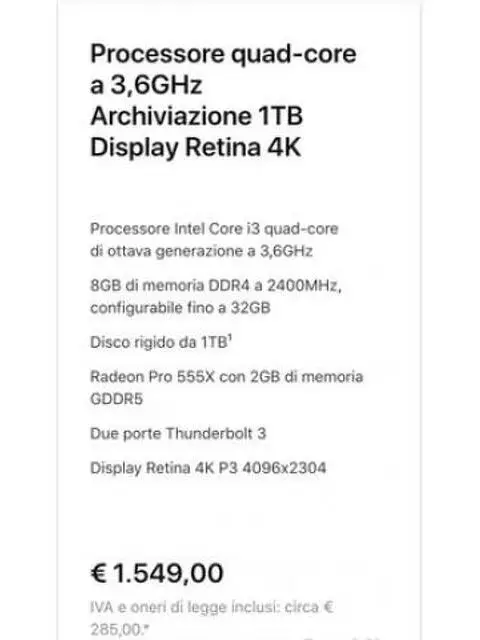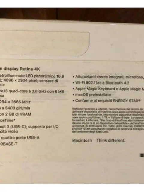 Vendo iMac 21.5" displei RETINA 4K - 1TB del 2019 acquistato nel febbraio 2020 con mouse tastiera e scatola originale, con scontrino e garanzia, usato pochissimo per inutilizzo. Praticamente NUOVO.