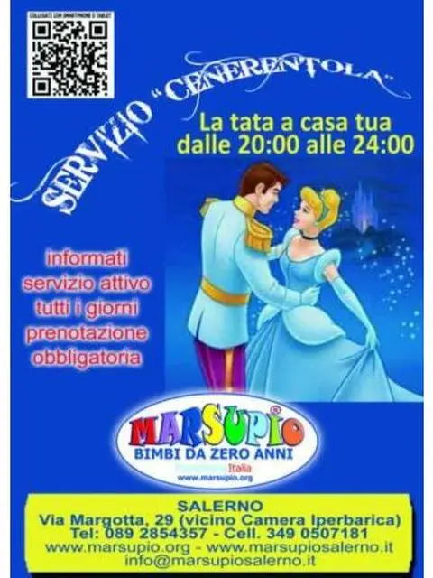 L'associazione ludica marsupio offre il servizio di baby sitter a domicilio. Personale esperto, qualificato e con esperienza e a vostra disposizione per prendersi cura dei vostri bambini. indirizzo: via g. margotta, 29 (vicino camera iperbarica) salerno per info: 0892854357; 3490507181