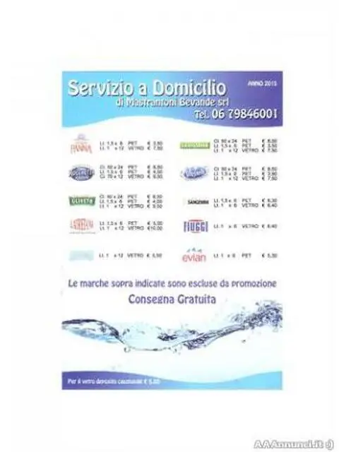 Consegniamo acqua a domicilio in tutta roma. Offriamo un ottimo servizio ad un ottimo prezzo con consegna GRATUITA. Visionate il volantino, con un'ordine minimo di 10 casse ne avrete 1 in omaggio, su acqua da 1,5 lt e 0,50: Popoli, Santa Croce, Nerea, San Benedetto, Sant'Anna, Santagata, Lete, Claudia, Egeria, Ferrarelle e Nepi. Ottimi prezzi anche sull'acqua in vetro da 1 lt, vale l'offerta 10+1 tra le seguenti acque: Santa Croce, San benedetto, Nepi, Ferrarelle, Egeria e Lete. Contattateci per altre informazioni! Abbiamo anche birre, bevande analcoliche, aperitivi, succhi di frutta e tanto altro. Il nostro ufficio è aperto dalle 9:00 alle 13:00!