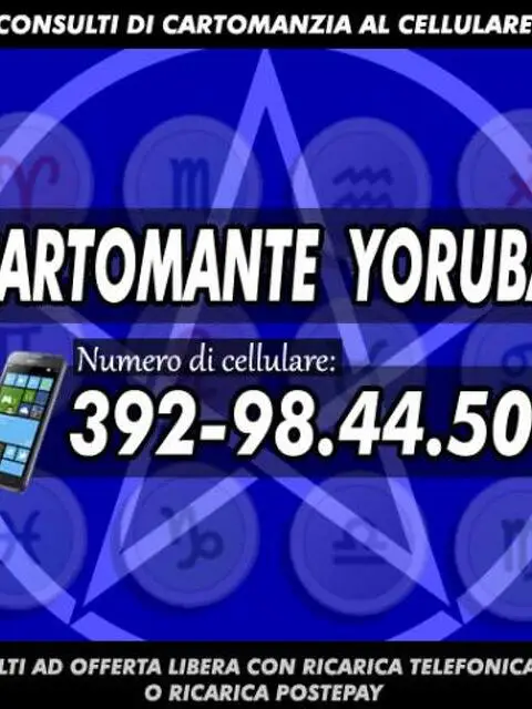 .•*¨ Studio di Cartomanzia Cartomante Yoruba' ¨*• Cartomante con esperienza pluriennale, specializzato nell'arte dei Tarocchi (gli Arcani Maggiori), effettua consulti di Cartomanzia tutti i giorni, compresi domeniche e festivi, dalle ore 9 alle ore 18 nel tempo massimo fissato in 30 minuti. Chiama il numero di cellulare che vedi nella foto presente in questo annuncio per fissare un appuntamento telefonico. A fronte di ogni singolo consulto il consultante e' pregato di lasciare un'offerta libera mediante ricarica telefonica Wind secondo quanto verrà comunicato telefonicamente. Cartomante Yoruba'.