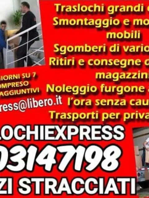 SE DESIDERI UN TRASLOCO SICURO, AFFIDABILE, FATTO DA PERSONALE ITALIANO, DI QUALITA' PROFESSIONALITA' E SERIETA' ALLORA CHIAMACI, E CHIEDI UN PREVENTIVO GRATUITO, E SCOPRIRAI LA CONVENIENZA E SOPRATTUTTO LA TRASPARENZA DEI NOSTRI PREZZI. TRASLOCHIEXPRESS, ESPERIENZA ULTRAVENTENNALE, QUALITA' PROFESSIONALITA' A PREZZI DAVVERO STRACCIATI, PROVA. SIAMO SEMPRE APERTI, DAL LUNEDI ALLA DOMENICA, AGOSTO COMPRESO E SENZA COSTI AGGIUNTIVI, PROVA!! TRASLOCHI COMPLETI grandi, medi e piccoli, a privati studenti e ditte, su Bologna, provincia ed anche fuori regione. PERSONALE ITALIANO PROFESSIONALITA' E PUNTUALITA' GARANTITE. SMONTAGGIO E RIMONTAGGIO mobili ed arredamenti, di ogni tipo ( DALL'ANTICO AL MODERNO ), Esperienza ultraventennale, professionalità e puntualità garantiti. SGOMBERI A PREZZI STRACCIATI DI: cantine, garage, abitazioni, magazzini, uffici, negozi, soffitte, e tanti altri spazi ancora. SGOMBERI ANCHE GRATIS MA SOLO SE LA MERCE E' IN BUONO STATO E COMMERCIABILE. SMALTIMENTI DI: Elettrodomestici, mobili, computer e tanto ancora, nelle apposite isole ecologiche autorizzate. TRASPORTI DEDICATI, a privati e ditte, anche fuori regione. RITIRI E CONSEGNE da grandi magazzini tipo: IKEA, MONDO CONVENIENZA, LEROY MERLIN, ETC. NOLEGGIO FURGONE con autista, a 30 euro l'ora, senza cauzione. PROFESSIONALITÀ, PUNTUALITÀ, E CORTESIA SEMPRE GARANTITI. Disponibiltà 7 giorni su 7, dal Lunedì alla Domenica, Agosto compreso, senza costi aggiuntivi. PREVENTIVI E SOPRALLUOGHI GRATUITI. PER INFO: 3703147198 ANCHE SU WHATSAPP E-mail traslochiexpress@libero.it PER RICEVERE UN PREVENTIVO IMMEDIATO, INVIATECI LE FOTO DEI VOSTRI ARREDI O DI QUALUNQUE ALTRO OGGETTO DOBBIATE SMONTARE O SOLAMENTE SPOSTARE DA UNA CASA AD UN ALTRA, E VI RISPONDEREMO SUBITO, PROVARE PER CREDERE!!! Il Sig. Giuseppe è a vostra disposizione per qualsiasi informazione desiderate avere. NON ESITATE A CONTATTARCI, PER QUALSIASI INFORMAZIONE VI OCCORRA. AFFIDATEVI ALL'ESPERIENZA È SEMPRE LA MIGLIORE SOLUZIONE.