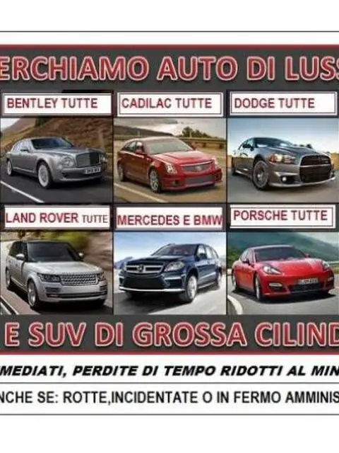 Acquisto auto di grossa cilindrata, acquisto fuoristrada Suv di pregio di grossa cilindrata, acquisto Mercedes tutte, Acquisto Bmw auto e Suv di grossa cilindrata, Acquisto Toyota Land Cruiser, Acquisto Lexus, Acquisto Ferrari, valuto qualsiasi tipo marca di auto di prestigio Compro auto coupe, acquisto cabrio, ricerco compro anche se con fermi amministrativi o con ipoteca, anche se incidentate, fuse, pago contanti o assegno circolare ritiro veloce, passaggi o radiazione immediati, contattatemi per il vostro usato di valore che volete vendere, o che dovete togliervi per motivi fiscali, su cui volete monetizzare velocemente senza tante problematiche e domande 3476989482