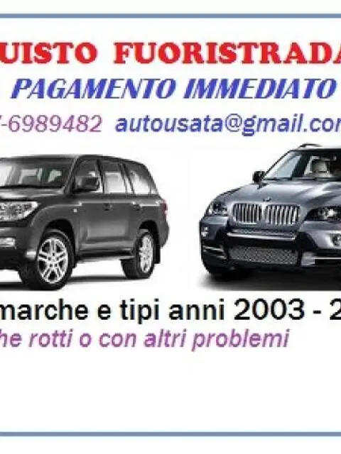 Devi vendere il tuo Suv o fuoristrada per problemi economici o fiscali, lo compriamo noi con un pagamento immediato, lo radiamo per esportazione e definiamo velocemente la gestione documentale, ritiriamo qualsiasi marca e tipo preferiamo veicoli anni 2004-2013 ritiriamo anche se ipotecati, relativi a prestiti bancari, o gravati da preavvisi di fermo amministrativo 347-6989482 autousata@gmail.com