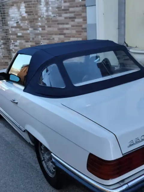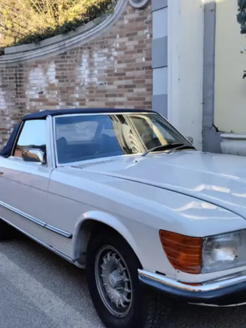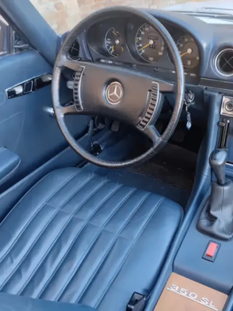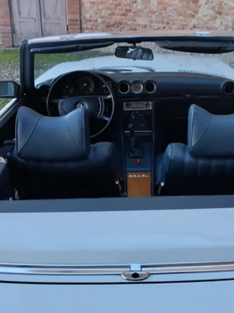 Mercedes 350 SL (R107), anno 1971, primissima serie, italiana da sempre, cambio manuale, omologata 4 posti a libretto, hard-top, iscritta ASI, aria condizionata (appena caricato il climatizzatore), 136000 km totali percorsi, bella combinazione di colori esterno bianco codice colore Papyrus White 717 e interni in pelle blu, motore 3500 cc V8 (il primo motore V8 montato sulla serie SL).