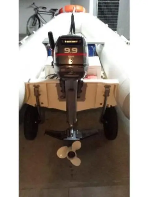 Vendo per passaggio a categoria superiore gommone Arimar, anno 2013 mod. top line 360 vtr, chiglia in vetroresina, completo di cuscino prendisole prua del valore di euro 400, panca di seduta rivestita e ruote alaggio posteriori. Il tutto in perfette condizioni utilizzato 10 volte in acqua dolce e sempre rimessato in box. Possibilità acquisto motore Yamaha mod.9.9F 2T anno 2006 anch'esso in perfette condizioni, qualsiasi prova, al quale sono state montate n.2 pinne stabilizzatrici come da foto, vendo a euro 1.700. Di seguito le caratteristiche tecniche gommone: Lunghezza: 3,51 mt. Larghezza: 1,67 mt. Diam. Tubolari: 43 cm. Num. Comparti: 3 portata persone: 5 massa kg.: 78 potenza max: 25 hp cat. Prog. Ce: c Contatto mail oppure telefonico orario pasti. Prezzi non trattabili.
