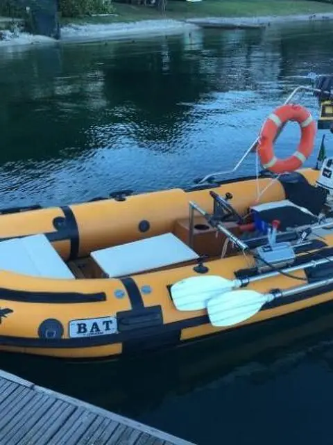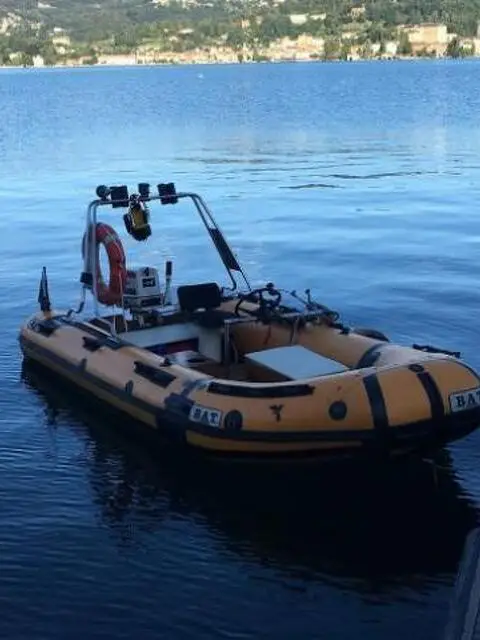 Vendo gommone BAT Cormoran 5, 4,20 metri, con rollbar, luci di via, pompa di sentina e tromba più varie dotazioni di bordo accessoriato con MOTORE MARINO FUORIBORDO JOHNSON 20 HP 521 appena revisionato e carrello stradale omologato 650 kg. Assicurazione irrisoria. Si guida senza patente.