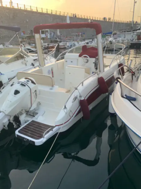Vendesi imbarcazione anno 2010 cabinata con bagno motorizzata con Evinrude e-tec 115cv 2010 290 ore di moto olio usato sempre e solo Evinrude appena tagliandato completo compreso giranda Strumentazione digitale 2 indicatori carburante 2 batterie nuove appena messe di 100ah Luci subaque Verricello elettrico Illuminazione cortesia led Antenna per Tv Econscandaglio Stereo nautico BOSS con casse nautiche Lavello Bocchettoni carburante e acqua in acciaio 2 plancette consumi irrisori Tendalino da prua a poppa Tenda per chiusura ermetica Cuscinetia perfetta attacchi fox per la navigazione Timoneria sostituita ad aprile insieme al tagliando NON PERDITEMPO NO SCAMBIO PREZZo poco trattabile possibilità di altre foto La barca già sta in acqua a Torre del greco
