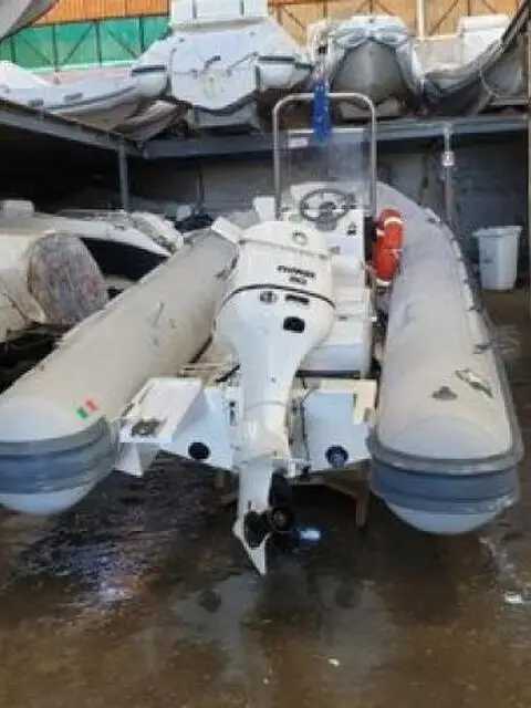 Gommone Novamarine e motore evinrude 90hp 2 tempi del 2003. Ore di moto poco più di 100. Mai tenuto a mare. Sempre in garage e rimessaggio al coperto. Cuscini nuovi e originali,copri gommone nuovo,copri motore nuovo, tanica in plastica originale e tanica supplementare di 10lt. GPS,ecoscandaglio, doccetta, pompa di sentina, igloo,ancora di 6kg con catena e cima,staccabatteria,scaletta da sub rimovibile, senza tendalino.Pari al nuovo. Pronto alla boa. Il prezzo è trattabile.