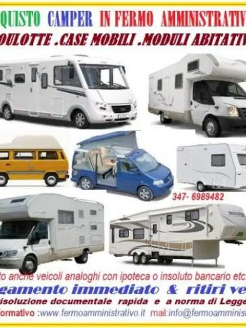 Acquisto Camper gravati da Fermo Amministrativo pagamento immediato, ritiro anche con gravame di ipoteca, valuto anche roulotte moduli abitativi, e comunque tutti i veicoli con questi tipo di problemi, di qualsiasi marca e tipo, ritiriamo anche se rotti, gestione documentale a norma di Legge, potete contattarci per domande sul problema del vostro fermo amministrativo, siamo una ditta operante nel settore da anni, non vi offriamo inutili atti di vendita, passaggi di proprietà, o trasferimenti all'estero del veicolo come tanti fanno, che sono cose illegali, affidatevi a chi vi propone una soluzione definitiva reale e che vi fa dormire tranquilli, con pagamento immediato . 347-6989482 info@fermoamministrativo.it
