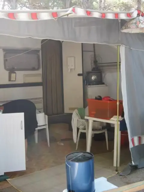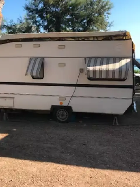 Caravan 4 mt in buono stato. Quattro posti letto, completa di veranda, telo antigrandine, tutti gli accessori per campeggio ( sanitari bagno, frigorifero grande, tavolo, sedie, lettini spiaggia, sdraio, accessori cucina, ecc). Situata in rimessaggio all'Isola d, Elba.
