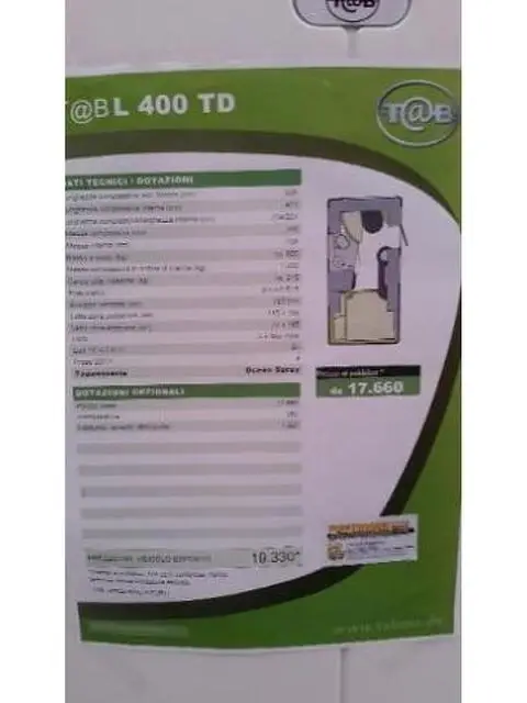 TABBERT Other T@B L 400 TD CARAVAN A GOCCIA NUOVA Caratteristiche del veicolo Chilometraggio: Immatricolazione: Tipo di veicolo: nuovo Carburante: Altro Potenza: kW / 0 CV Tipo di cambio: Altro Marce: Colore esterno: Argento Colore interno: Garanzia: 24 casa Carrozzeria: Camper - Roulotte Cilindrata: Cilindri: Porte: Posti: Equipaggiamenti: Descrizione fornita dal venditore: CARAVAN T@B LA CARAVAN A GOCCIA ! COMPATTE, LIGHT FASION ,TRENDY AERODINAMICHE E ...BELLE!!! FINALMENTE IN ITALIA UNICA CONCESSIONARIA CON ESPOSIZIONE COMPLETA , ricambi assistenza accessori e consigli da chi una caravan T@b la vive e usa da tempo!! LE MITICHE CARAVAN A GOCCIA DELLA FAMIGLIA KNAUS-TABBERT Lunghezza totale incl. timone (cm)597 Lunghezza effettiva (cm)421 Larghezza totale / Larghezza interna (cm)225/204 Altezza totale / Altezza interna (cm)261/198 Massa del veicolo vuoto (kg)910 Massa in ordine di marcia (kg) *980 la massa massima a pieno carico (kg)1.100 carico utile massimo ammissibile (kg)220 dimensioni dei pneumatici205/65 R15 dimensioni ruote5 1/2 J x15 Dimensioni letto posteriore in cm145 x 198Dimensioni letto pieghevole in cm70 x 195cappe numero2 + Sky View Numero luci 12 V / 230 V9 / - Numero 230 V prese4scatola Gas timonekg 2x11 Listino prezzi in Euro incl. 22% di IVA.17660,- MODELLO T@B 400 TD VISIONABILE IN SEDE E ORDINABILE Trasp e immatr. Accessoriabile per tutte le vostre esigenze MODELLO piu' piccolo leggero compatto ed economico: T@B 320 RS VISIONABILE IN SEDE E ORDINABILE PREZZI A PARTIRE DA € 10260 prezzo franco fabbrica IMMATRICOLAZIONE ESCL. Venite a vederele ora da CONTATTACI PER INFO E PREZZI. FUSTINONI SPORT CURNO BERGAMO per info e appuntamenti 035/611262