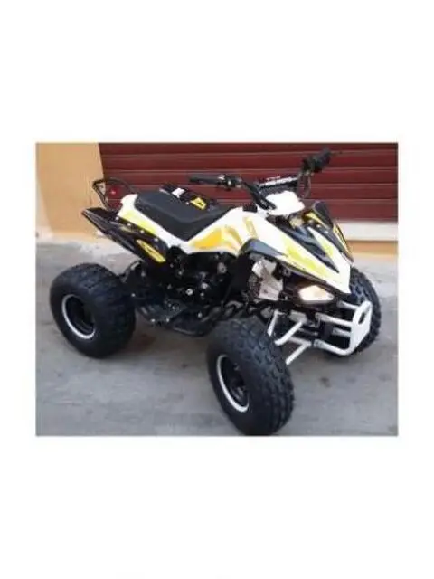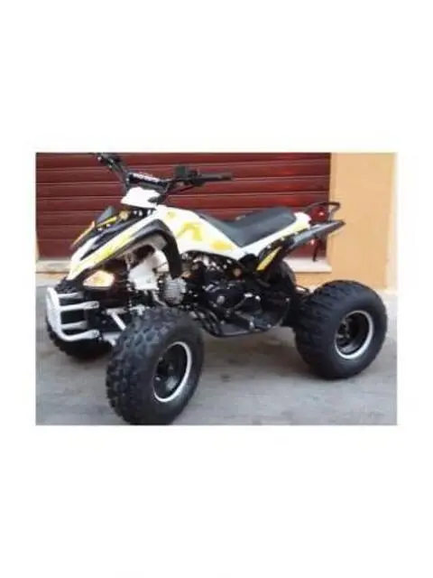QUAD MONSTER R7 Possibilità di acquistare a parte grafiche personalizzate € 25,00 come vedi immagini versione in bianco. Vari colori disponibili: Bianco, Nero, Giallo, Rosso, Blu, Verde Oliva CARATTERISTICHE: MOTORE:4 tempi monocilindrico raffreddamento ad aria125cc 75hp AVVIAMENTO:Avviamento elettrico manuale PNEUMATICI:7" FRENI :Anteriori a tamburo Posteriore a disco SOSPENSIONI :2 anteriori a molla 1 posteriore a molla VELOCITA':75kmh MISURE :141cmx88cmx94cm Sella dal suolo 74 cm PORTATA MAX :120 kg circa CARBURANTE:Benzina DOTAZIONI PARTICOLARI Doppio scarico Carter di protezione sul totale giro catena Avviamento in metallo Frizione con molle rinforzate Telaio completamente rinforzato Filtro aria sportivo Racing Blocchetto start con doppia chiave Ruote tacchettate Dispositivo per salite Certificazione CE NON OMOLOGABILE AD USO STRADALE CERTIFICAZIONE RILASCIATA DA ENTE ITALIANO LA MINIMOTO E' COME LA SI VEDE IN FOTO, TELAIO RINFORZATO SIMILE BLATA OTTIMA QUALITA' AD UNA SUPER OFFERTA POSSIBILE VENDITA' ALL'INGROSSO E SPEDIZIONE IN TUTTA ITALIA DISPONIAMO DI TUTTI I PEZZI DI RICAMBIO A PREZZI IMBATTIBILI PER QUALSIASI ALTRA INFORMAZIONE NON ESITATE A CONTATTARCI Nota Bene: Prima di qualsiasi utilizzo del mezzo su strada verificare ed eventualmente stringere tutti i bulloni. L'Azienda declina ogni responsabilitè per qualsiasi tipo di danni a cose e/o persone.