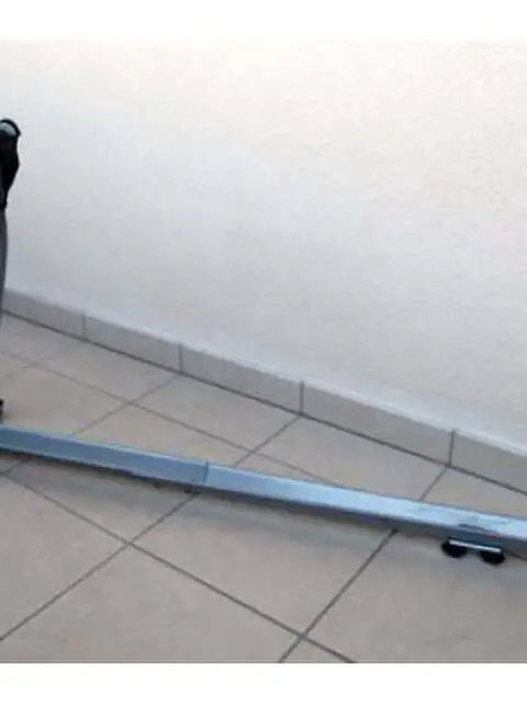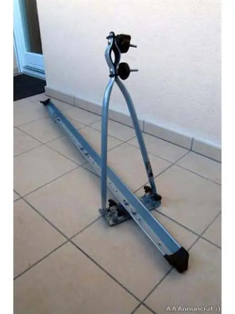 Robusto portabicicletta a doppia barra da poter montare comodamente sulle barre portapacchi/portatutto per auto. La doppia barra superiore che si può alzare o abbassare secondo la necessità, è di forma tubolare ed è corredata, al suo apice, di due resistenti morsetti e relativi pomelli avvita/svita, di cui uno provvisto di dispositivo antifurto con serratura a chiave. Entrambi devono essere utilizzati per bloccare e tenere stabile la bicicletta sul tetto dell'auto, in posizione verticale. Detta barra, dopo il suo utilizzo può essere abbassato in posizione orizzontate fino ad adagiarsi su quella sottostante. La Barra dove alloggiano le ruote è formata da due pezzi di ferro smaltati a forma di U allungabili o retrattili. L'oggetto è infine dotato di 3 morsetti a vite con relative piastre di tenuta ( 2 anteriori e uno posteriore) necessari per posizionare e bloccare il portabicicletta sul portapacchi e di 2 laccetti in fibra tessile artificiale con relativo dispositivo di sicurezza in ferro zingato, per bloccare le ruote della bicicletta nell'alloggio della barra sottostante. Misure: -La doppia barra a U è estensibile fino a cm.144; -La doppia barra tubolare per bloccare la bicicletta al telaio; cm.55 – movimento rotatorio di 180 gradi; Prezzo richiesto euro 30 + spese di spedizione da Merano (BZ)