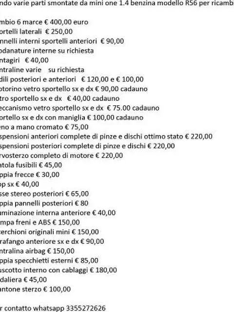 Vendo varie parti smontate da mini one 1.4 benzina modello R56 per ricambio : la lista la trova nelle foto con i prezzi chiedete per altri pezzi che non trovate nella lista spedizione con SDA e pagamento paypal per contatto whatsapp 3355272626